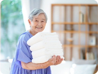 日常の中で「できること」はなるべくご自身で。洗濯物をたたむなどの動作も、自立支援の一環として大切にしています。お一人おひとりの想いに寄り添いながら、その方らしい日々を支えます。
