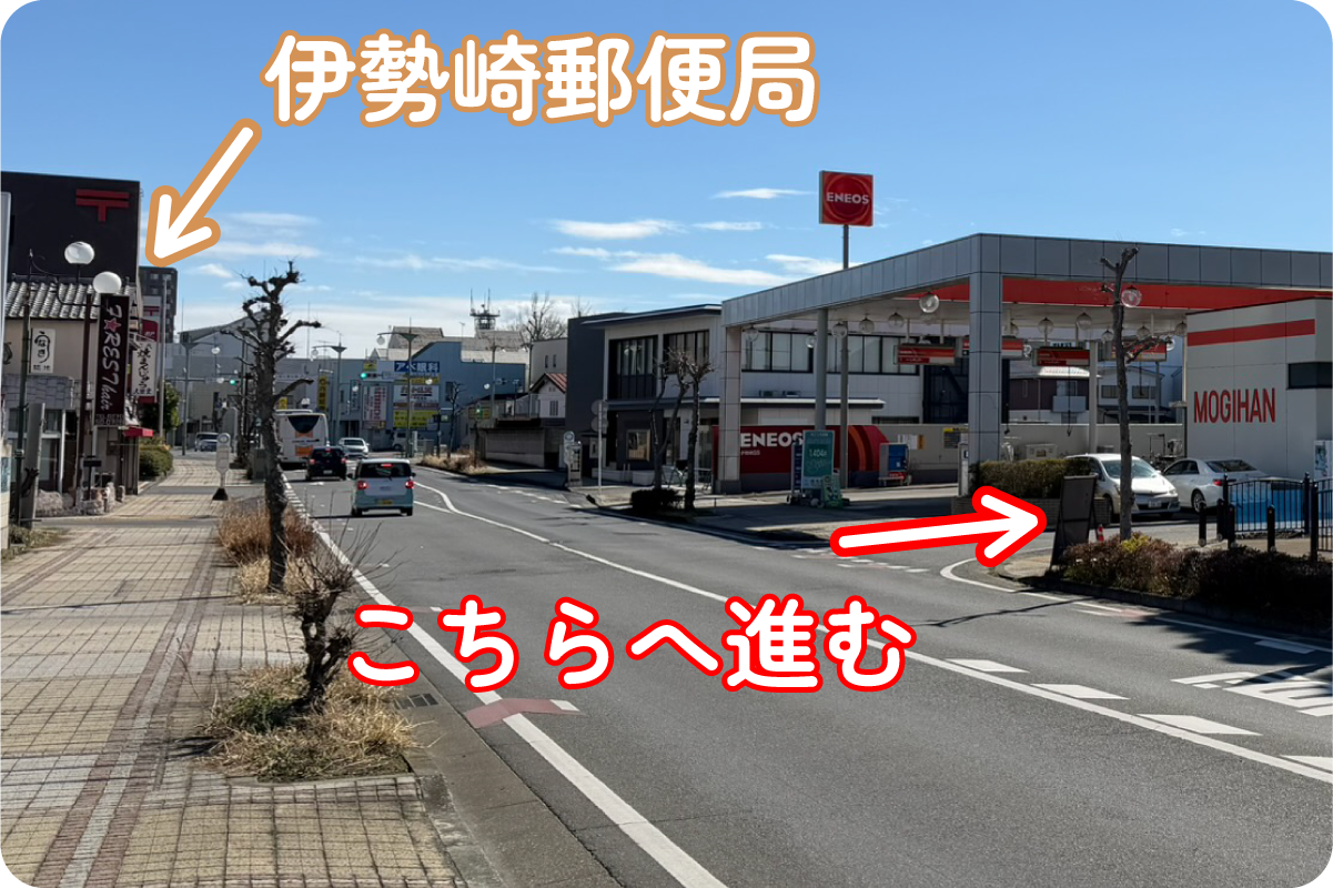 郵便局の西側にあるガソリンスタンドの脇の道を、南方向へお進みください。