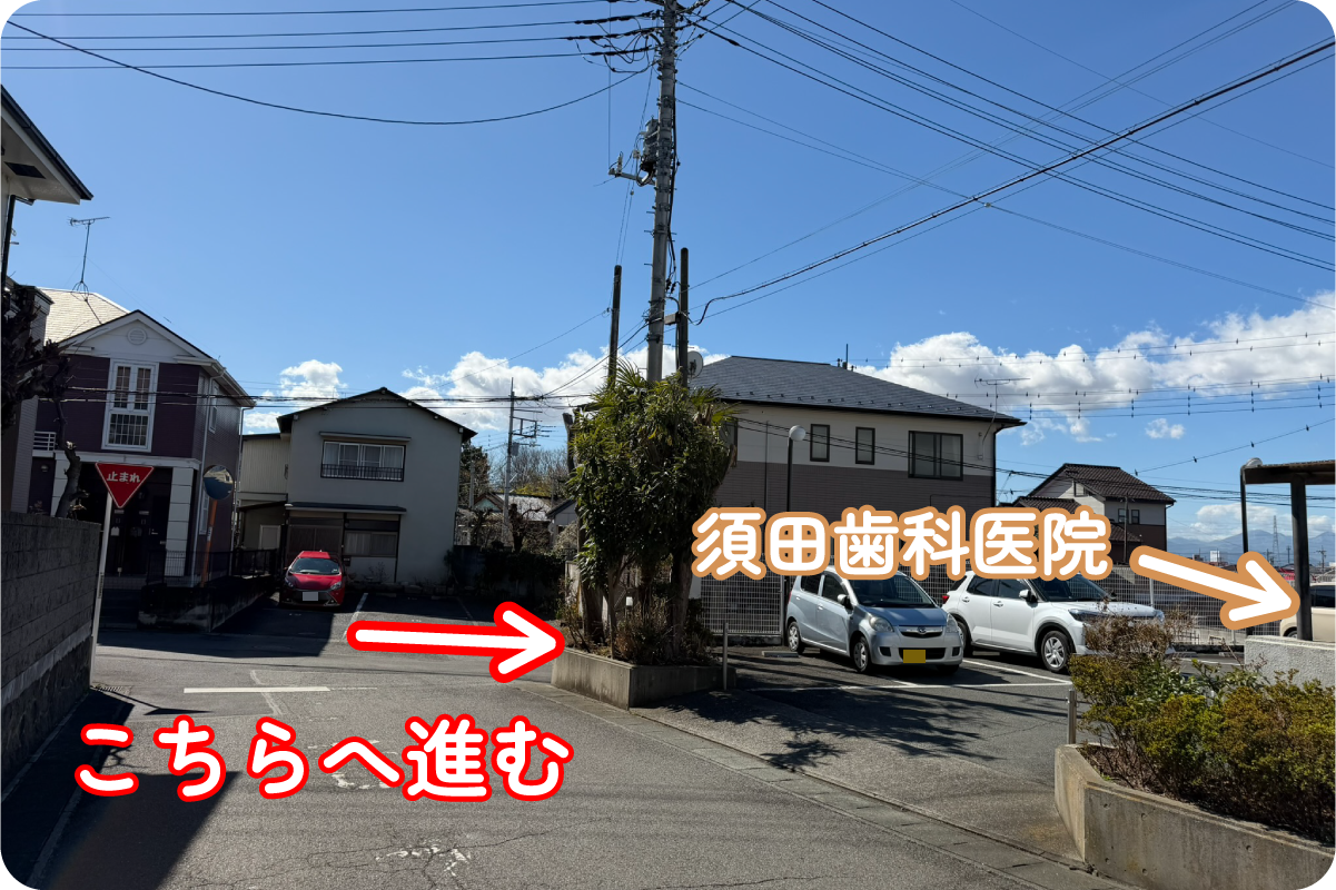約20メートルほど進むと、「須田歯科医院」のあるT字路に突き当たります。